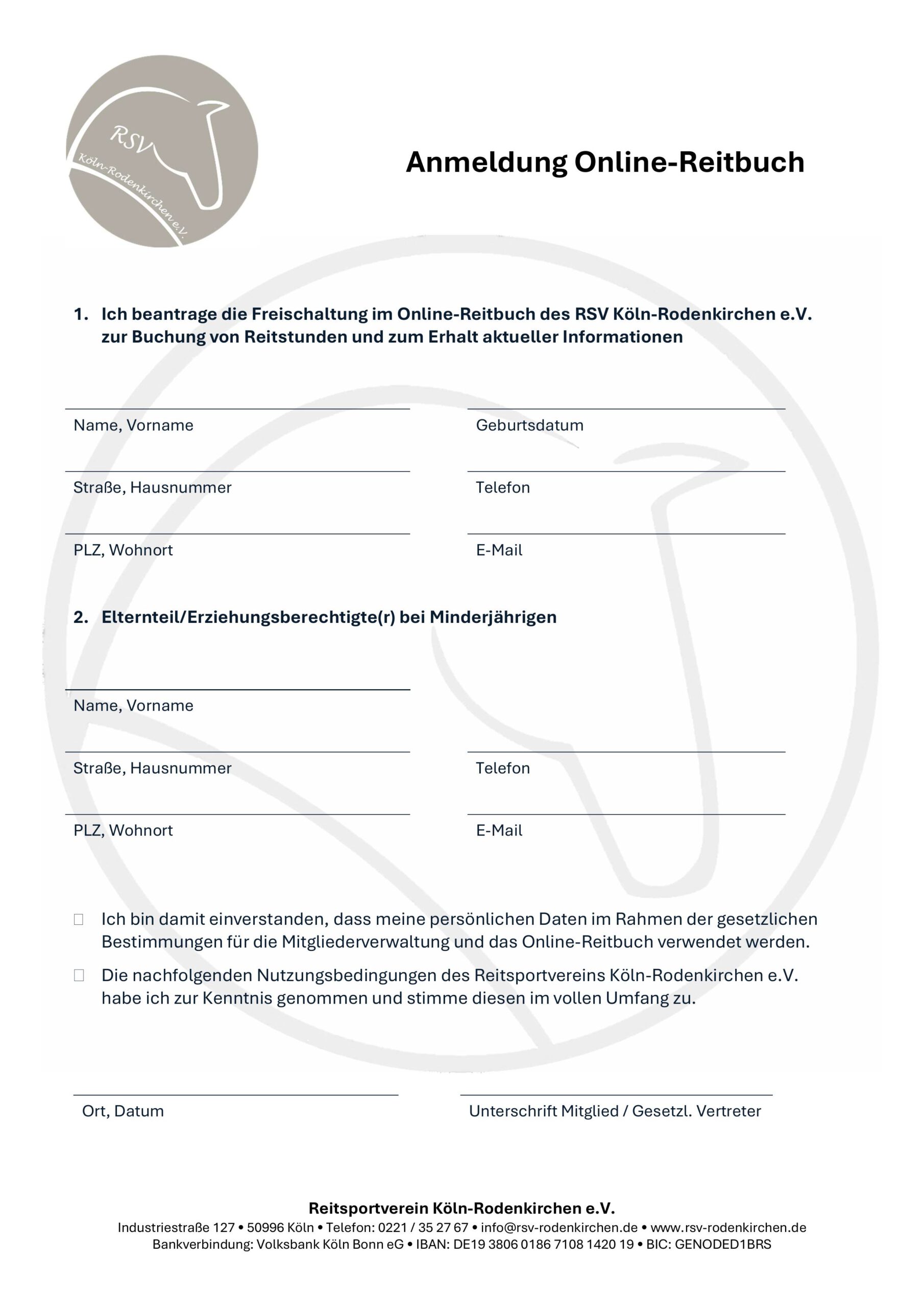 Mitgliedsantrag: Dein Kind möchte reiten? Du möchtest den RSV kennenlernen? Dann melde Dich oder Dein Kind einfach telefonisch oder auch vor Ort im Stall für eine Schnupperstunde an. Nach drei bis vier Schnupperstunden würden wir uns freuen, Dein Kind bzw. Dich als neues Mitglied im Verein begrüßen zu dürfen.